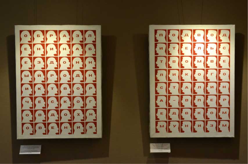 Творчество узбекского художника-концептуалиста Вячеслава Ахунова, напротив, сконцентрировано на визуальной культуре советского прошлого. В серии «АВС. Азбука тоталитаризма» он вспоминает, как новая коммунистическая власть проводила политику ликбеза для населения Центральной Азии с помощью политических плакатов и огромных литер, которые устанавливали буквально везде.