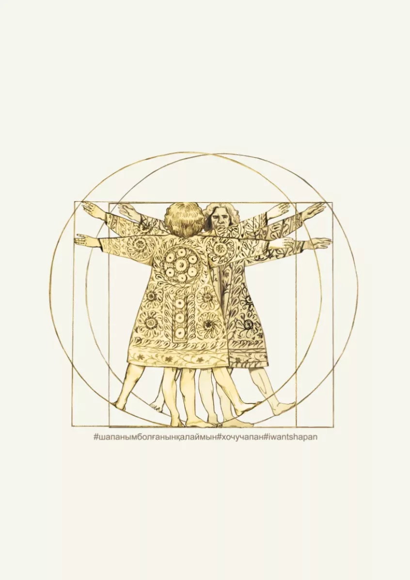 Суть ее проста: берем узнаваемые и знаменитые как Кейдж произведения западного искусства или его героев (с некоторыми вкраплениями локального) и надеваем на них чапан, бергек, жаулык и другие предметы традиционного гардероба. Результатом такого брендинга становится удивительная по визуальной силе серия, с легкими и понятными сюжетами, которые тем не менее идут дальше простой самоиронии. Тут есть и Марина Абрамович, сидящая напротив азиатской версии Улая, и Витрувианский Человек в расшитым золотом кафтане и, что уж совсем авангард, дивы Нью-Йоркского квир-сообщества, а также постоянные гости модных галерейных открытий Ив и Адель.