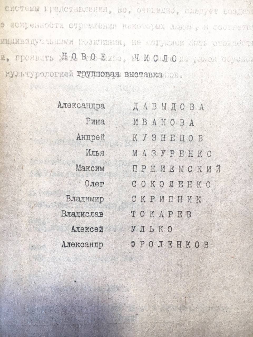 Самаркандский круг художников в 1990 году провел совместную выставку «New number» в Государственном Музее-Заповеднике. В составе группы были Александра Давыдова, Рина Иванова, Андрей Кузнецов, Илья Мазуренко, Максим Приемский, Олег Соколенко, Владимир Скрипник, Владислав Токарев, Алексей Улько, Александр Фроленков.