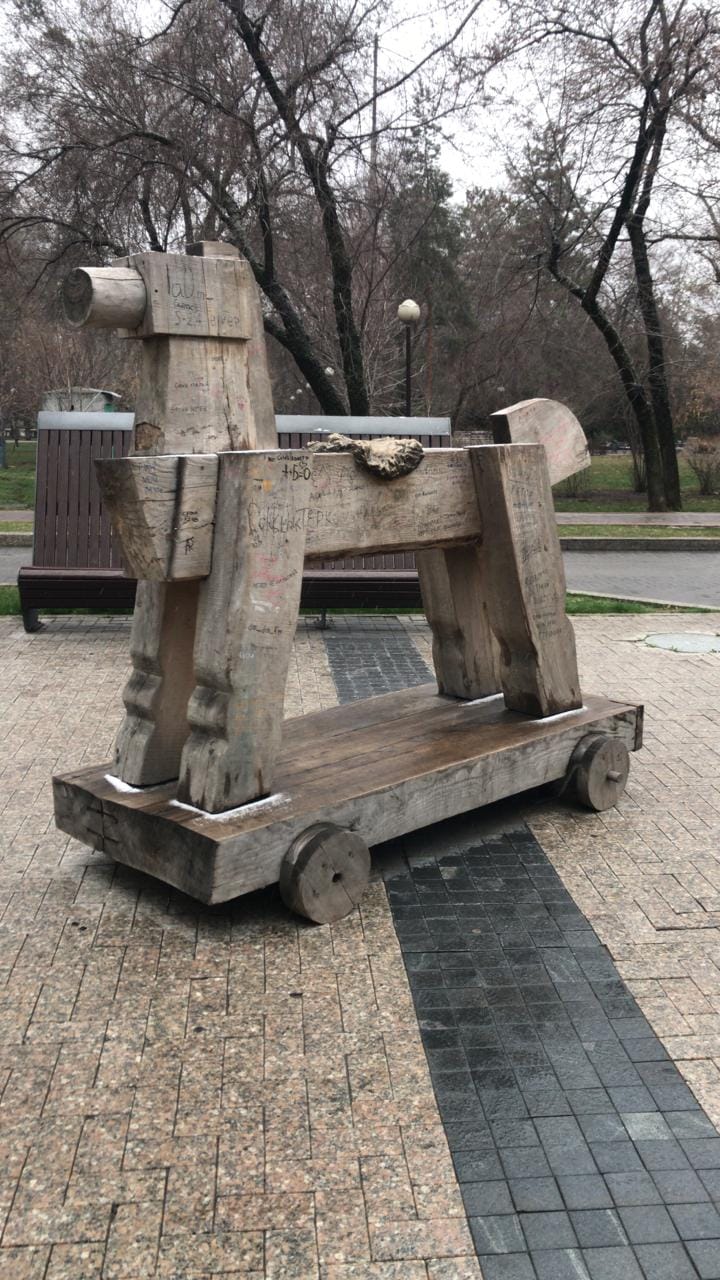 11 апреля из поста куратора современного искусства Дастана Кожахметова мы узнали, что любимая горожанами скульптура «Рождение седла» пропала с улицы Панфилова. Вместе с художником они попытались выяснить, что произошло, и нашли работу на одной из городских свалок.